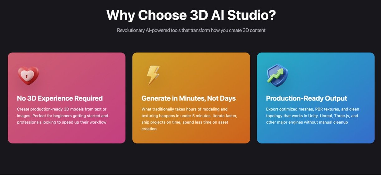3D AI Studio turns simple text descriptions or uploaded images into professional 3D models in seconds, making 3D creation easy for anyone without needing design skills. This AI-powered platform speeds up workflows for game developers, artists, and creators by handling modeling, texturing, and optimization automatically. Users love its speed, quality, and compatibility with popular tools like Unity and Blender.
