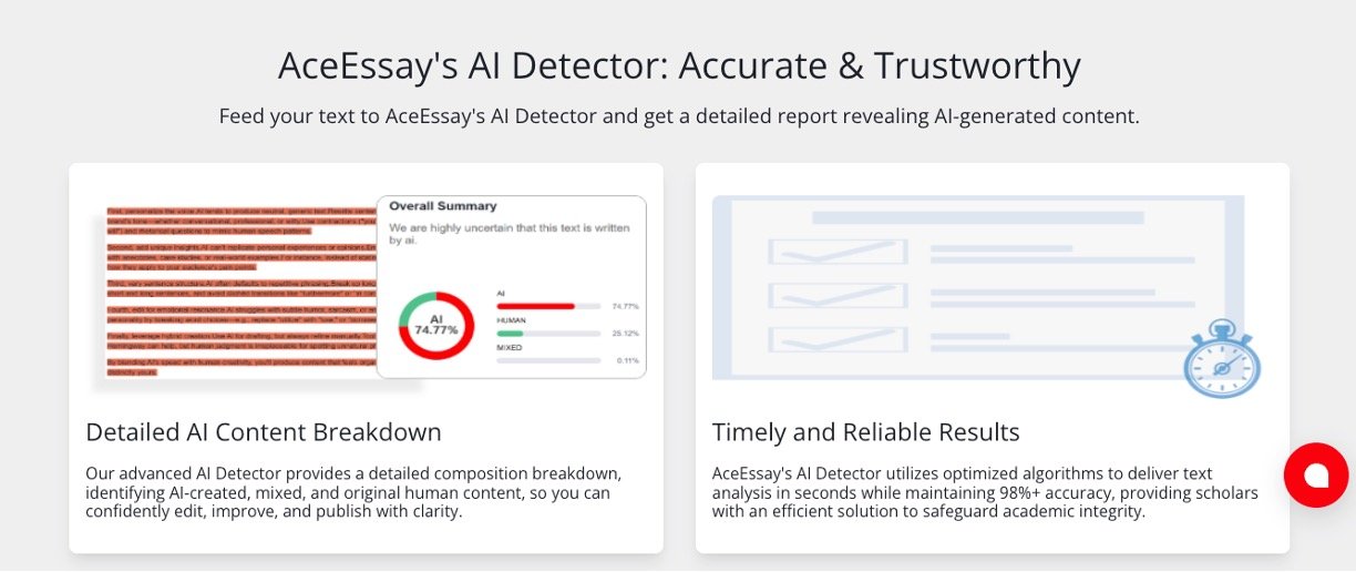 Ace Essay AI Detector is a specialized and user-friendly tool designed to identify content generated by artificial intelligence in essays and other writings. It uses advanced AI algorithms to analyze writing patterns and language usage, accurately distinguishing between human-written and AI-generated text. Beyond detection, it also offers a humanization feature that refines AI-generated text to make it sound more natural and authentic. This makes Ace Essay valuable for students, academic institutions, writers, and content creators aiming to ensure originality and authenticity in their work.