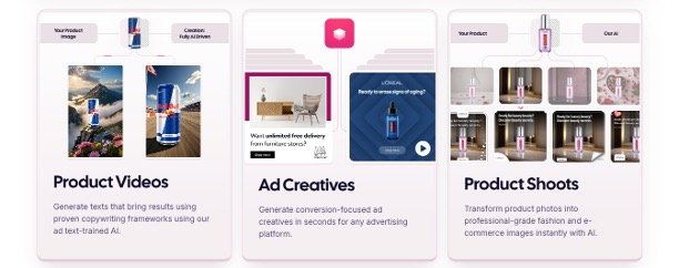 Product Photoshoots: Transforms basic product photos into pro e-commerce images or videos with backgrounds removed and effects added.