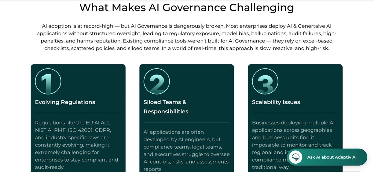 Adeptiv AI is your all-in-one platform that makes managing AI safe and simple. It automatically finds all your AI tools and projects, checks for risks like bias or errors, and keeps everything compliant with over 30 global rules—like the EU AI Act or NIST standards—all in real time. No more spreadsheets or manual checks; it handles inventory, monitoring, documentation, and audits so businesses can use AI confidently without headaches.