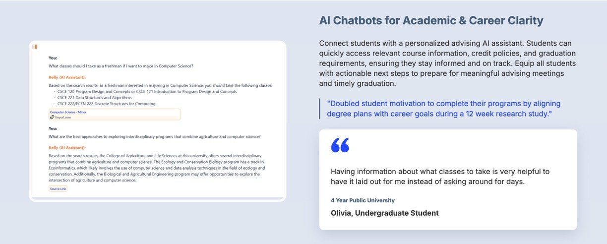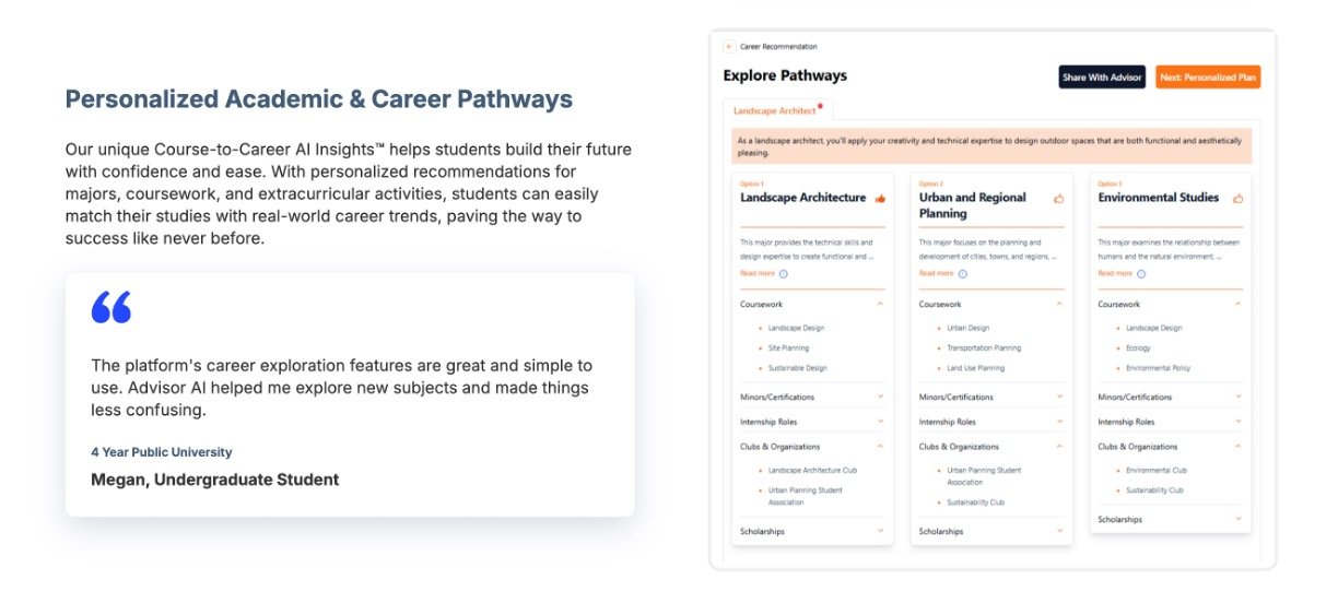 Advisor AI is an end-to-end, easy-to-use student success platform designed to empower students from pre-enrollment to graduation with personalized academic guidance, career navigation, and integrated support. Using AI-powered course-to-career insights, the platform helps students confidently explore majors, build resumes, set milestones, and align degree plans with career goals. Advisor AI also supports academic advisors and career coaches with automated tracking, data-driven outreach, and collaborative workflows to provide individualized support at scale.