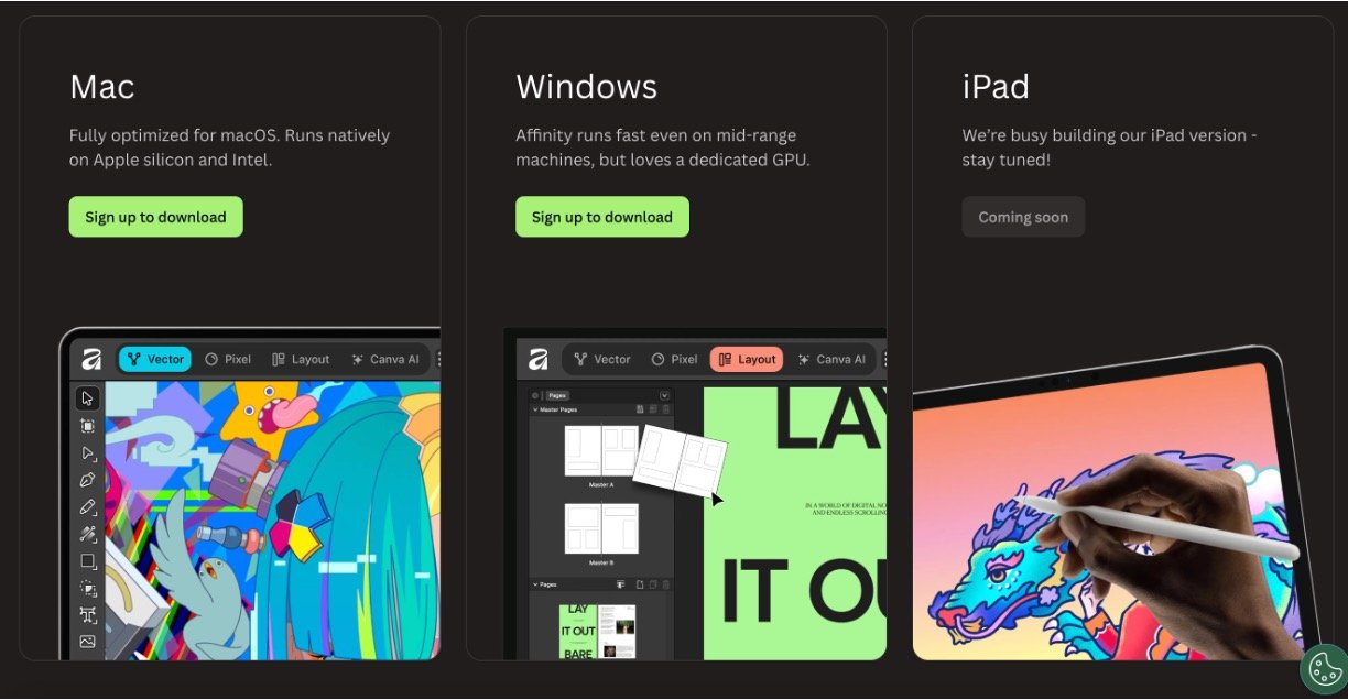 Unified workspace with three main studios: Pixel for photo editing, Vector for scalable graphics, and Layout for publication and page design.