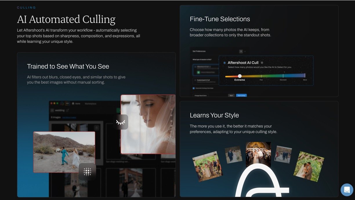 AI culling spots blurs, blinks, duplicates, and closed eyes while grouping similar shots to select the sharpest keepers.
