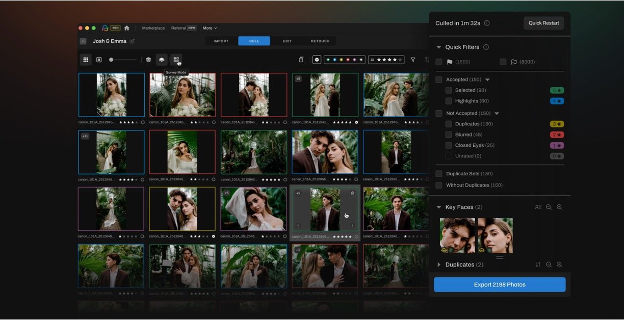 Wedding photographers culling 4,000+ images in under 15 minutes to deliver galleries faster and boost client satisfaction.