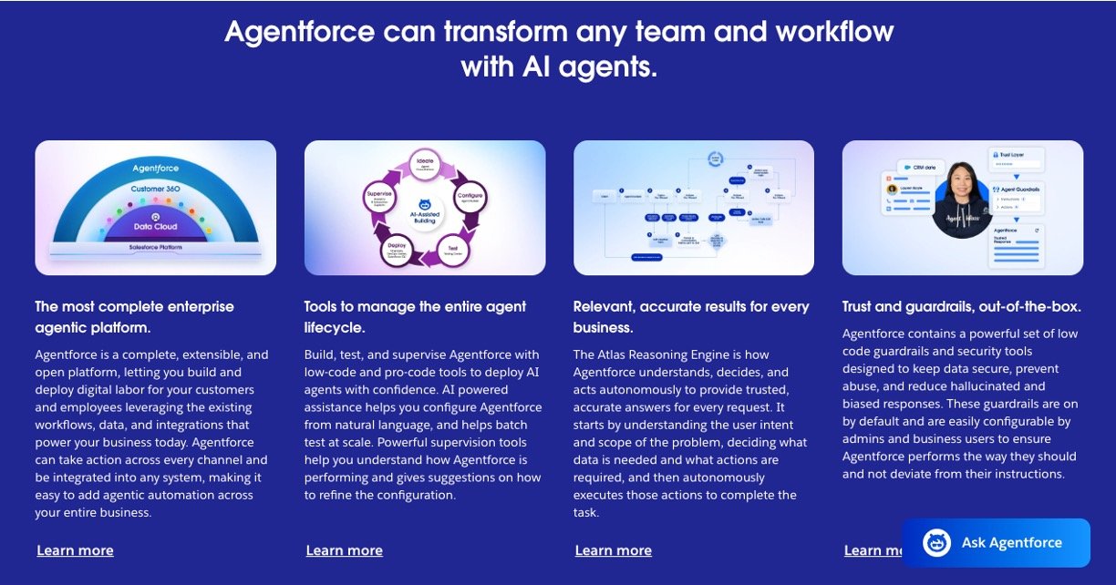 Salesforce Agentforce is a powerful AI agent platform designed to help businesses build, customize, and deploy autonomous AI agents that support employees and customers 24/7. These AI agents leverage Salesforce’s vast ecosystem and CRM data to provide personalized, accurate, and automated assistance. Whether it’s answering customer questions, automating sales tasks, or supporting internal employees, Agentforce uses advanced reasoning and trusted data to act proactively and efficiently.
