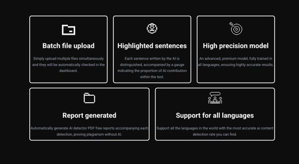 Provides detailed PDF reports highlighting AI-written sentences and percentages of AI contribution.