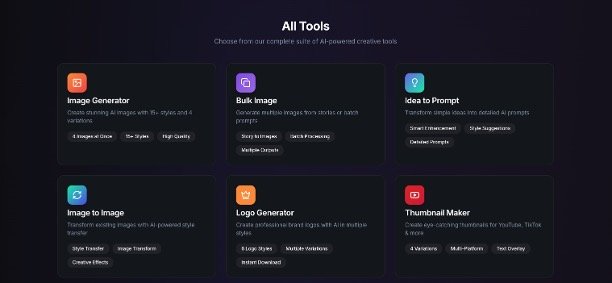 Wide range of AI tools such as Image Generator, Bulk Image, Idea to Prompt, Image to Image, Logo Generator, Thumbnail Maker, Script Generator, Article Writer, Viral Content Studio, AI Humanizer, Resume Writer, Essay Writer, and Keyword Generator.