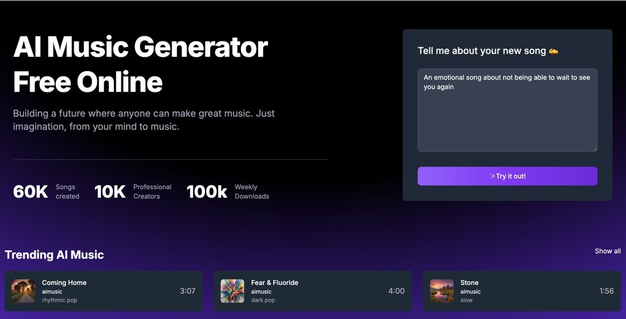 AI Music Generator is an advanced online tool that uses cutting-edge AI algorithms and machine learning to create original, high-quality music across multiple genres. It allows users to generate complete songs including melodies, arrangements, and vocals simply by describing their musical ideas or inputting lyrics. The platform aims to make music creation accessible and easy for everyone, from beginners to professionals, by providing an intuitive interface and customizable features that produce songs quickly without requiring any musical background.
