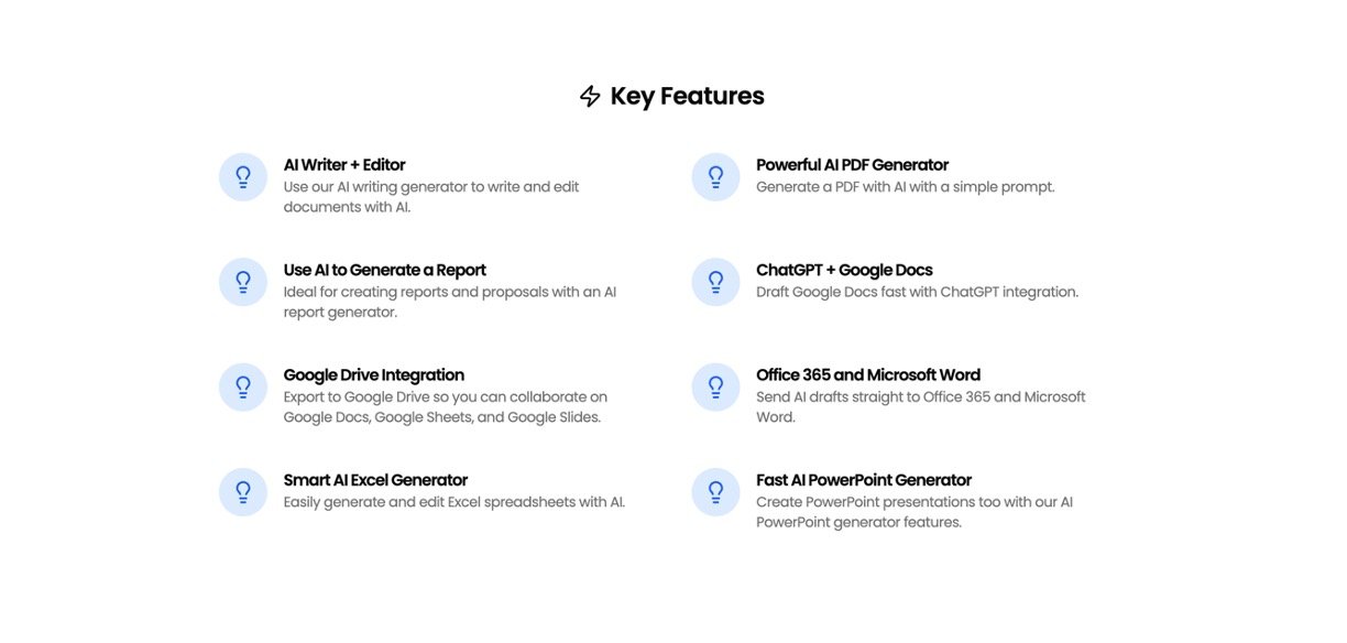 • AI-driven creation and editing of diverse document types such as reports, proposals, spreadsheets, presentations, and PDFs.