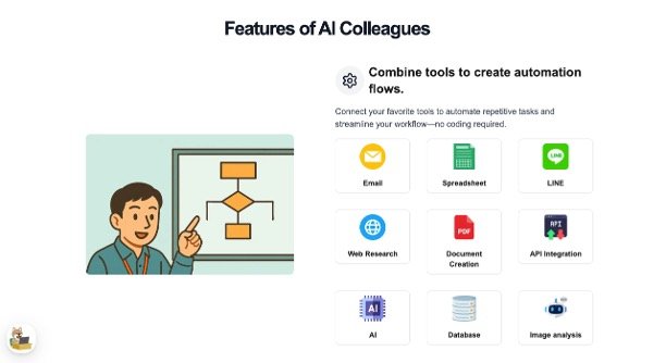 AIShain is a Japanese AI agent platform designed to automate routine business operations by simulating human employees, referred to as "AI Colleagues." These AI agents can autonomously handle tasks such as responding to emails, managing sales lists, generating quotes, and processing orders. By integrating with tools like email, LINE, spreadsheets, and databases, AIShain enables businesses to streamline workflows without the need for coding expertise. The platform offers a range of pre-configured AI Colleagues, each specializing in specific tasks, to help businesses operate more efficiently and reduce manual workload.