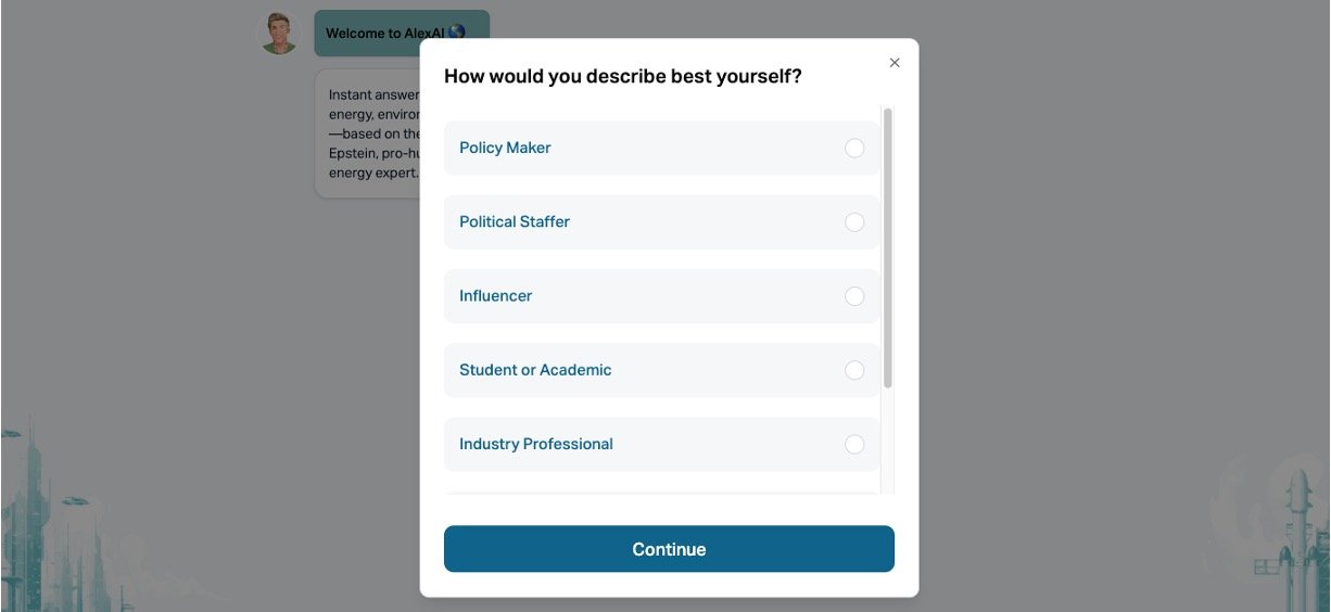 AlexAI is a free AI chatbot that delivers quick, reliable answers on energy, environment, and climate topics. It draws directly from the knowledge and writings of Alex Epstein, a pro-human philosopher and energy expert known for books like Fossil Future. No login needed—just ask tough questions and get responses that sound like Epstein himself, blending his articles, speeches, and real-time web info for clear, human-flourishing-focused insights.​