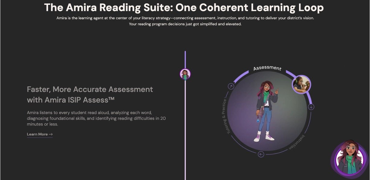 Personal AI Tutor (Amira Tutor™): Coaches each child one-on-one during reading practice, fixing errors on the spot and building skills like understanding stories.