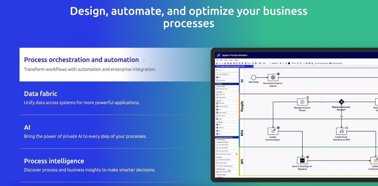 Appian turns messy business processes into smooth, intelligent operations using AI agents, automation, and data unification. Non-tech users can design apps, extract insights from documents, and automate repetitive or complex tasks like claims handling or patient onboarding. It ensures AI works within your processes with full visibility, security, and human oversight, delivering results like 30% faster claims or 83% shorter wait times.