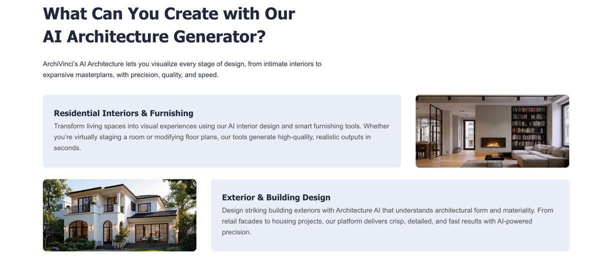 • AI Interior and Exterior Design: Generates realistic interiors and building exteriors with material, lighting, and furnishing suggestions.