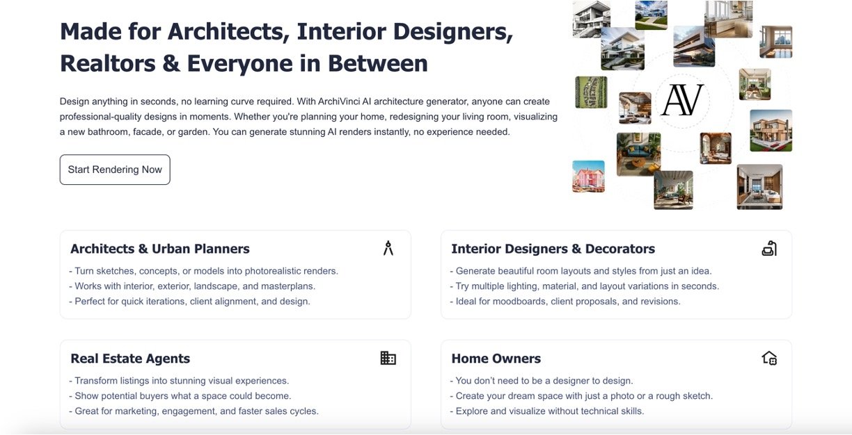ArchiVinci is an advanced AI-powered architecture and interior design platform that transforms sketches, photos, and 3D model screenshots into hyper-realistic architectural renders in seconds. It supports various design stages, including residential interiors, exterior building visualizations, urban planning masterplans, and virtual staging, enabling architects, interior designers, realtors, and even homeowners with minimal technical skills to create stunning visualizations quickly. The platform is cloud-based, works on any device without the need for powerful hardware, and offers tools like inpainting, style transfer, and AI-powered room and urban design, making it easy to visualize and iterate on design ideas with high precision and realism.
