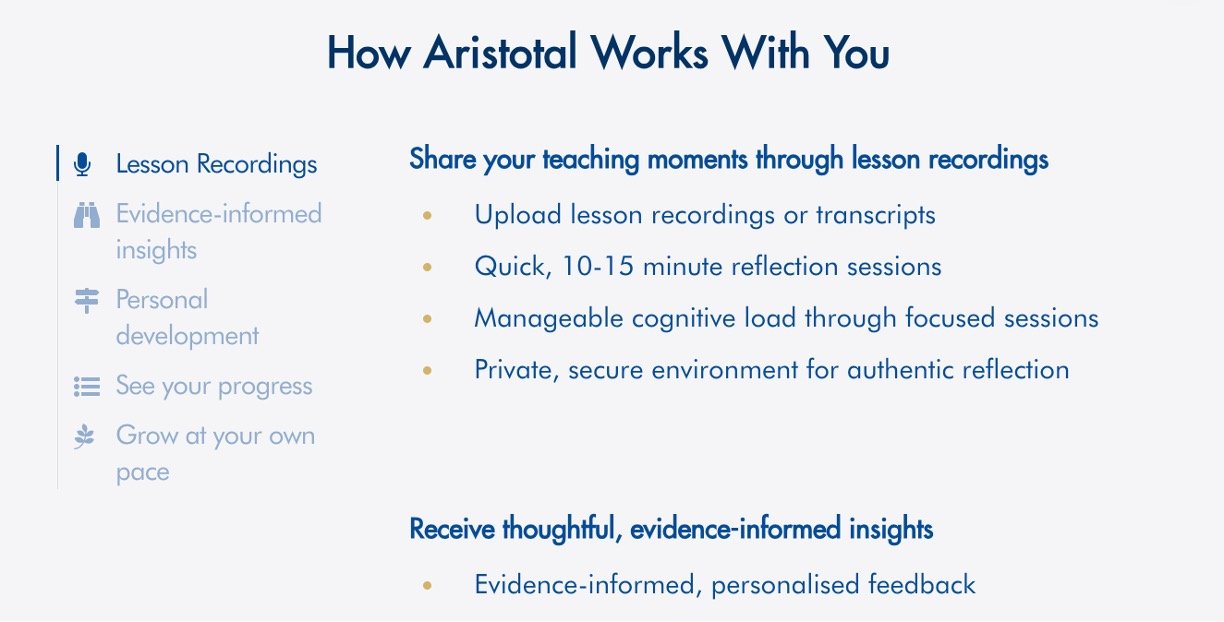 Aristotal is an AI-powered teacher coaching platform designed to help educators improve their teaching skills through personalized, evidence-based feedback and support. It provides a private and secure environment where teachers can reflect on their lessons, receive constructive, tailored suggestions, and track their professional growth over time. The AI analyzes teaching techniques using a wealth of educational research to offer non-judgmental, practical advice aligned with school goals and individual teaching styles.