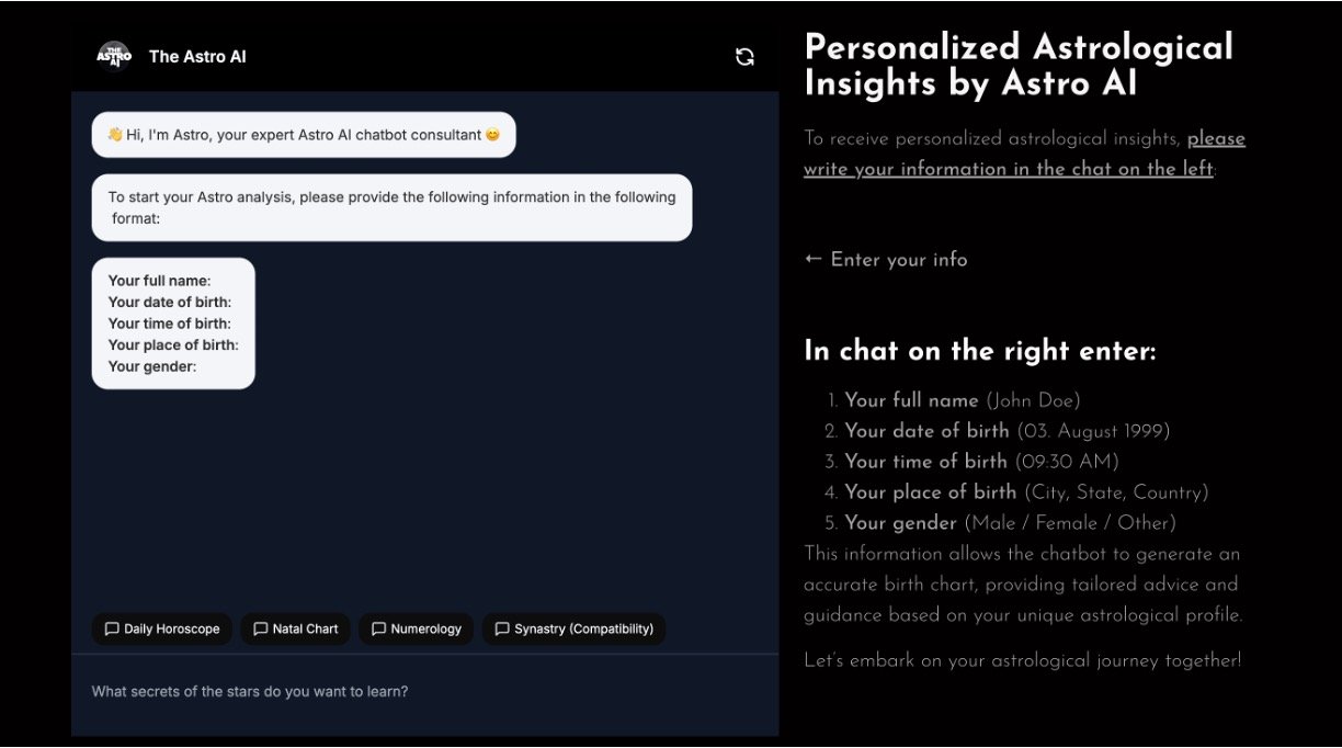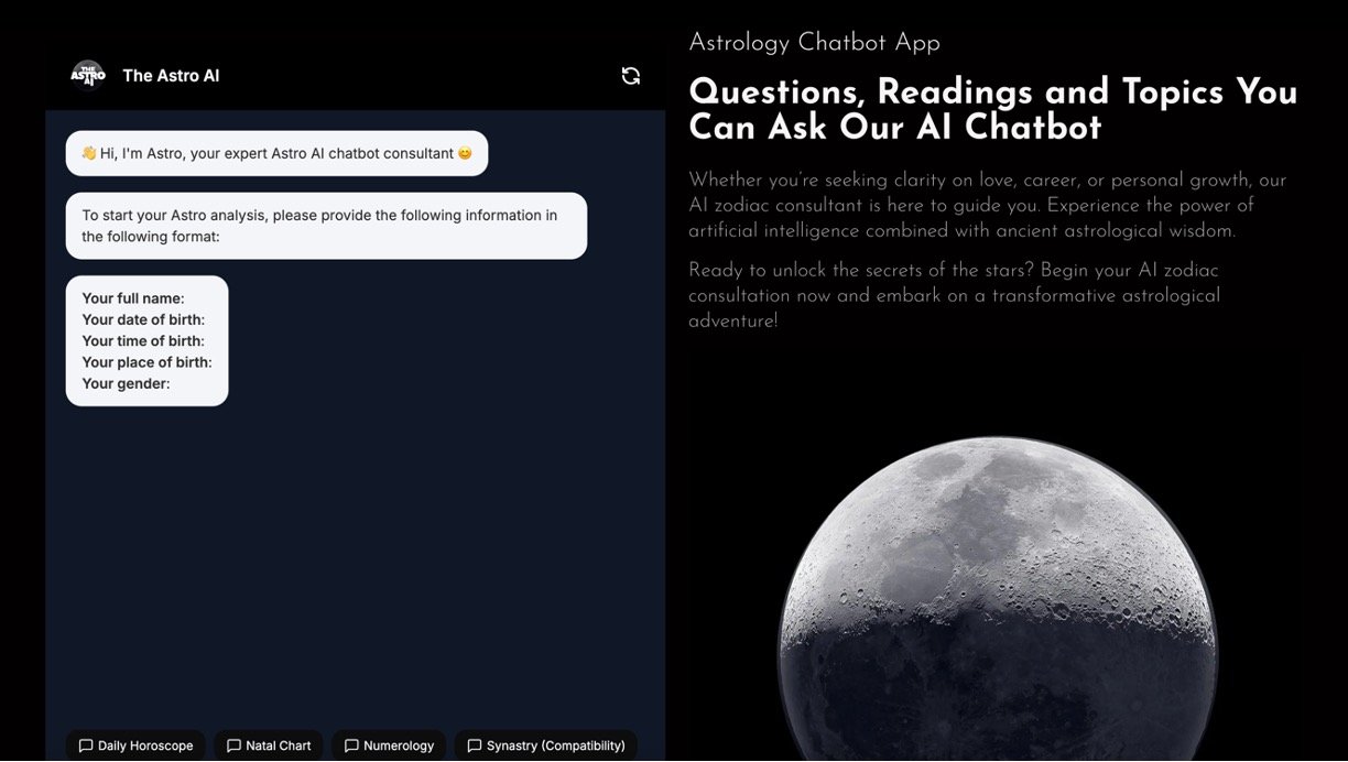 The Astro AI Chatbot is a free, AI-driven astrology platform that delivers personalized astrological readings and consultations instantly based on your own birth chart. Unlike generic horoscopes, it provides deep, individualized insights derived from your exact birth date, time, and location. This AI tool empowers users to explore detailed astrological guidance on various life aspects such as love, career, and personal growth at their own pace. Its interactive, chat-based interface makes astrology accessible and engaging for everyone, from curious beginners to seasoned enthusiasts, without overwhelming technical complexity.