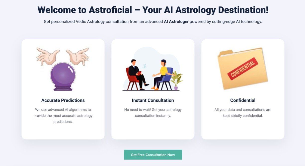 Astroficial is a cutting-edge AI astrology platform that fuses ancient Vedic wisdom with advanced artificial intelligence to deliver immediate and accurate astrological insights. It offers personalized birth chart analysis, daily horoscopes, and interactive AI chat consultations tailored to your individual cosmic profile. Users can easily explore career, relationships, health, and spiritual guidance through a user-friendly interface on both mobile and web. Astroficial democratizes astrology by making professional-grade predictions accessible and affordable, providing consistent, unbiased, and confidential readings any time of day.