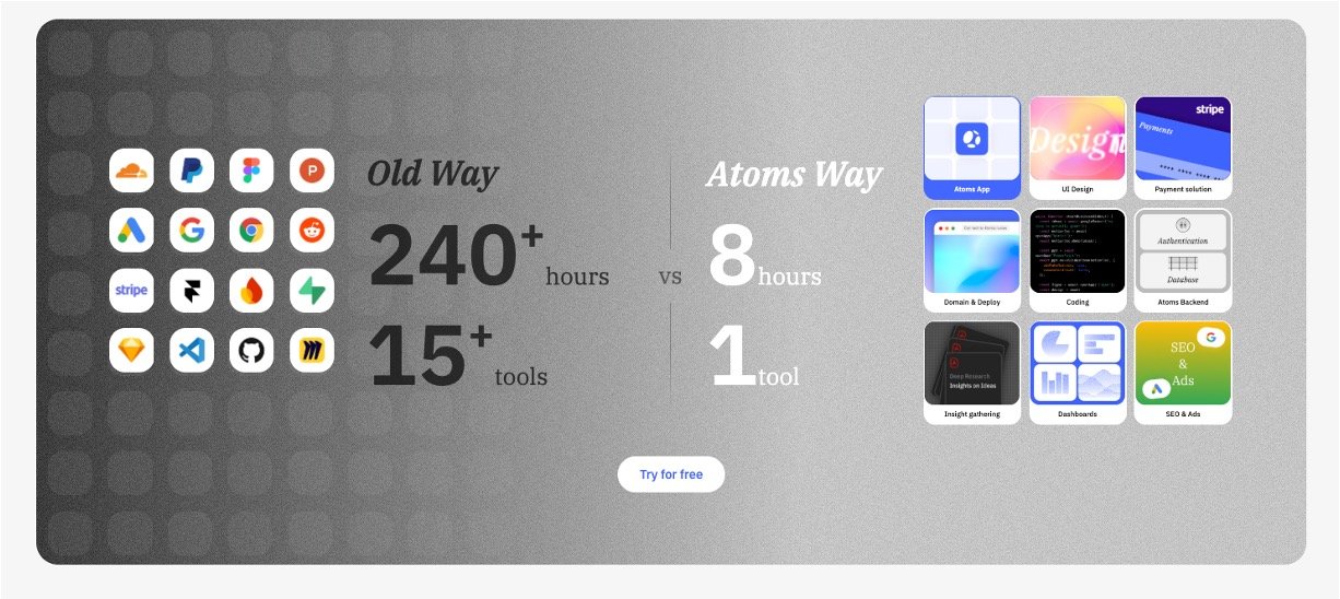 Chat-to-App Magic: Tell Atoms your idea in plain English, and it auto-builds complete pages, user flows, logins, data storage, and Stripe payments – ready to launch in minutes.