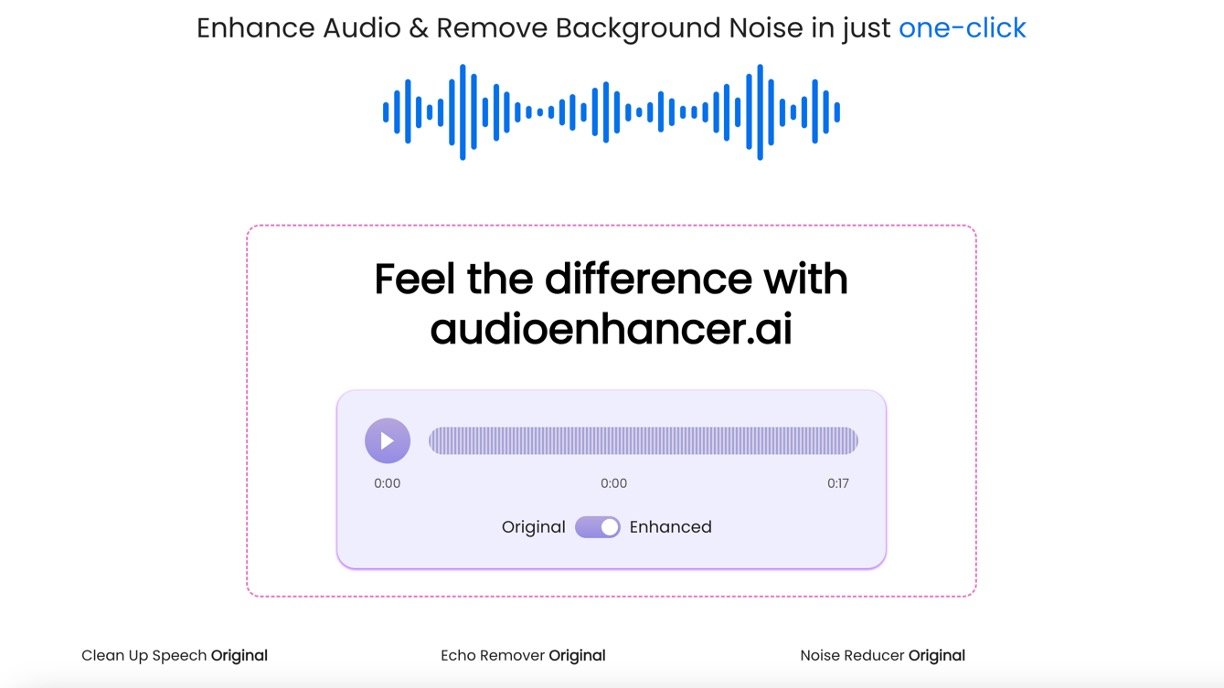 AudioEnhancer AI is a super simple online tool that uses smart AI to make your audio crystal clear by wiping out background noise, echoes, and other distractions. Just upload your file, hit enhance, and download the polished version – no tech skills needed. Perfect for anyone tired of bad sound ruining podcasts, videos, or calls, it turns shaky recordings into pro-level audio fast.​