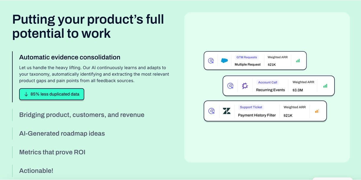 Automatic evidence consolidation: Identifies, extracts, and organizes product pain points from all feedback sources without manual tagging or triage.