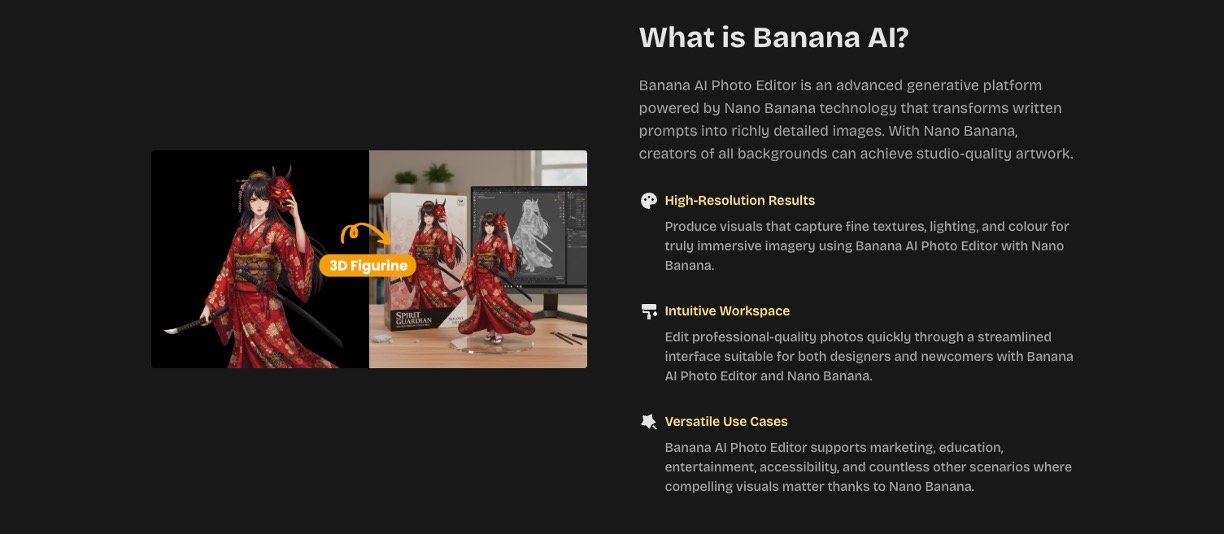 Banana AI brings Google's powerful Nano Banana technology to your fingertips, letting you generate stunning images from text prompts and edit photos like a pro. It excels at keeping characters consistent across edits and creates realistic visuals super fast, perfect for creators who want professional results without complicated software. Whether you're making social media posts or marketing visuals, this tool turns your ideas into polished content effortlessly.