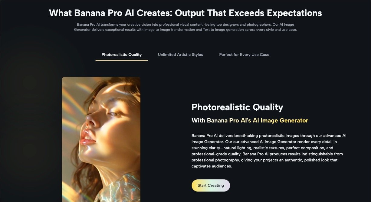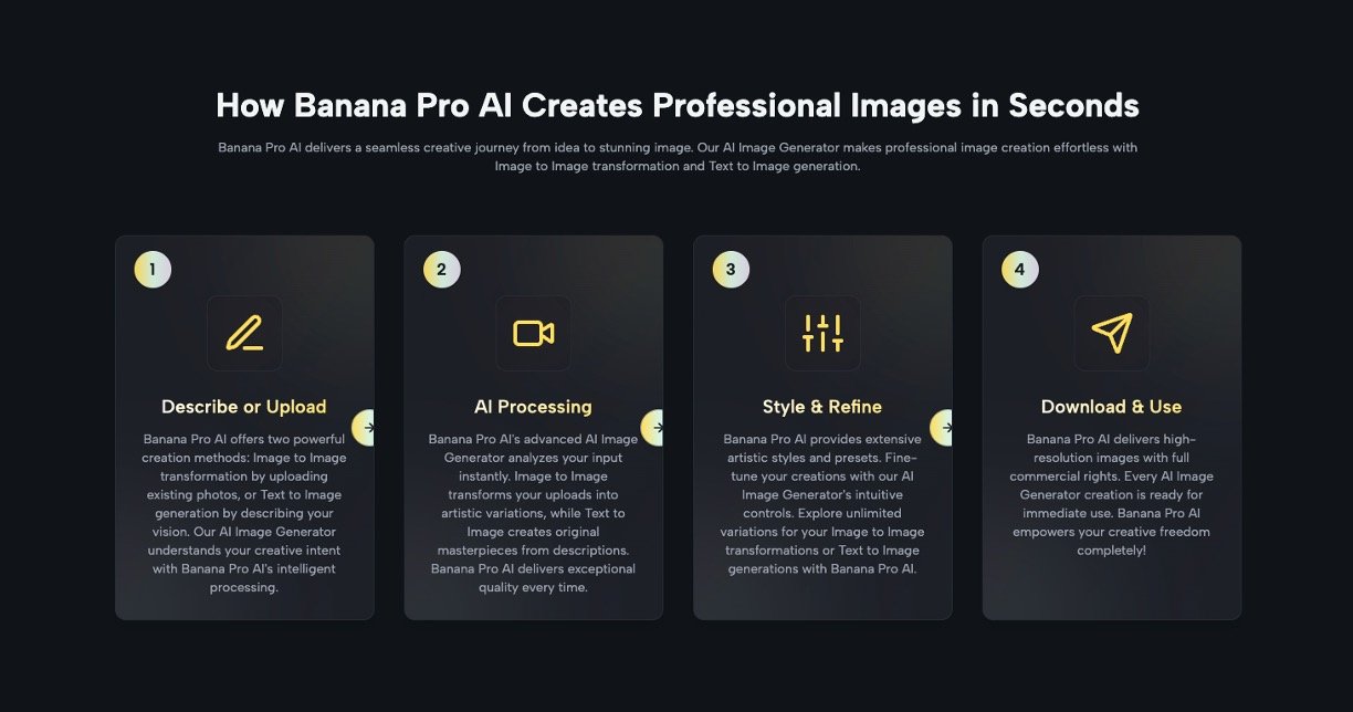 Banana Pro AI is a free online tool that turns your ideas or photos into professional-quality images super fast. Just type a description or upload a picture, and it creates amazing visuals like photorealistic photos, anime art, or custom designs. Perfect for anyone wanting high-end results without paying for designers or waiting hours—everything downloads ready to use, even for business.