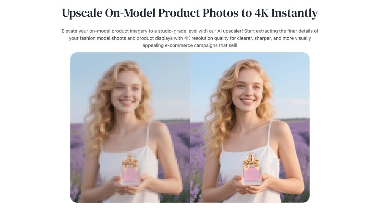 Enhance on-model fashion photos for Shopify or Amazon listings to meet zoom requirements and build buyer trust.