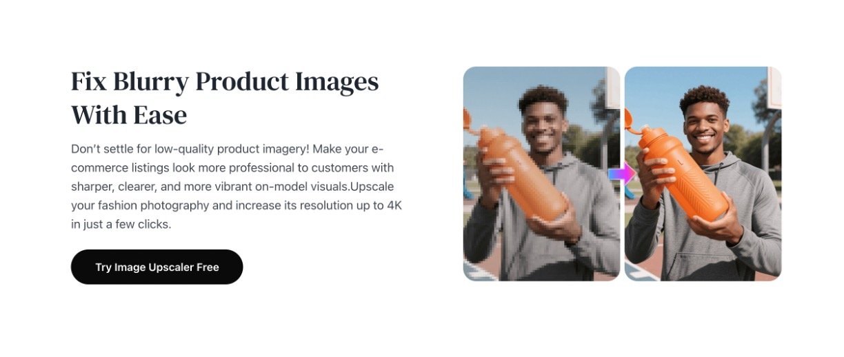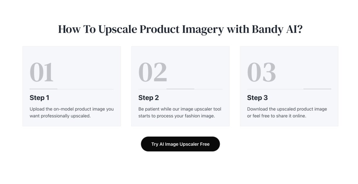 Bandy AI's Image Upscaler turns blurry or low-res product images into sharp, professional visuals perfect for online stores. This free online tool specializes in on-model fashion photos, restoring details, colors, and textures effortlessly—no design skills needed. Shoppers love crisp images that zoom beautifully, helping your listings stand out and sell more.