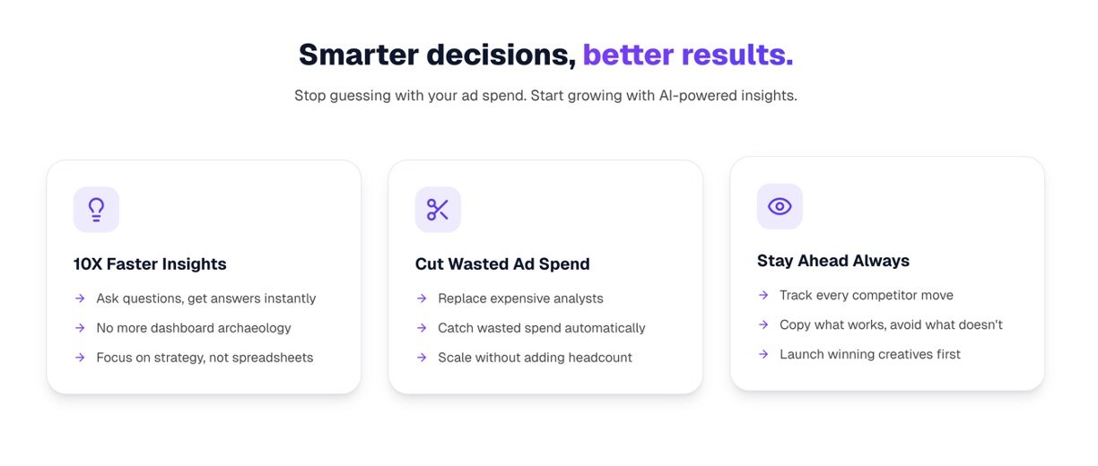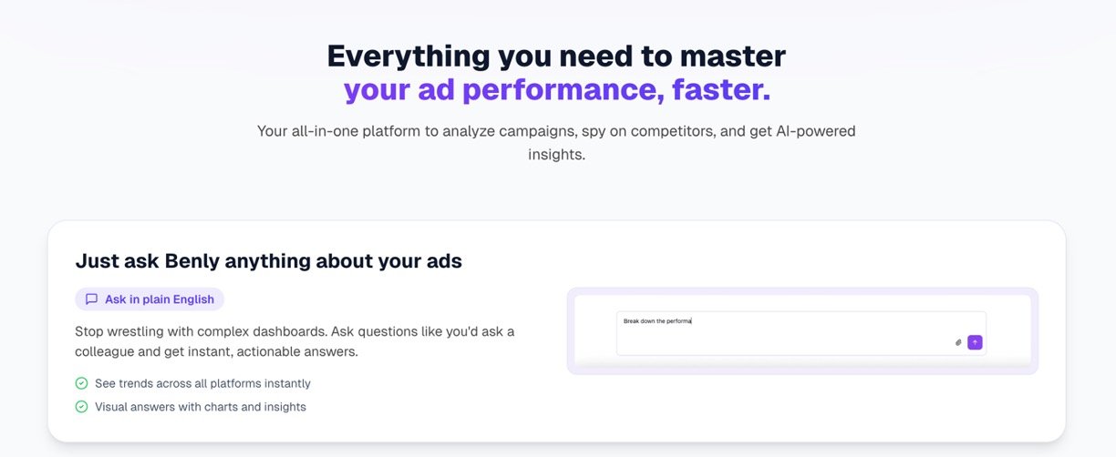 Benly AI simplifies advertising analysis by letting you ask questions in plain English and get instant insights from your ad data across platforms like Meta, TikTok, Google Ads, and GA4. No more switching dashboards or digging through spreadsheets—AI handles the heavy lifting to reveal trends, performance, and optimizations quickly. It's perfect for marketers who want smart decisions without tech headaches.