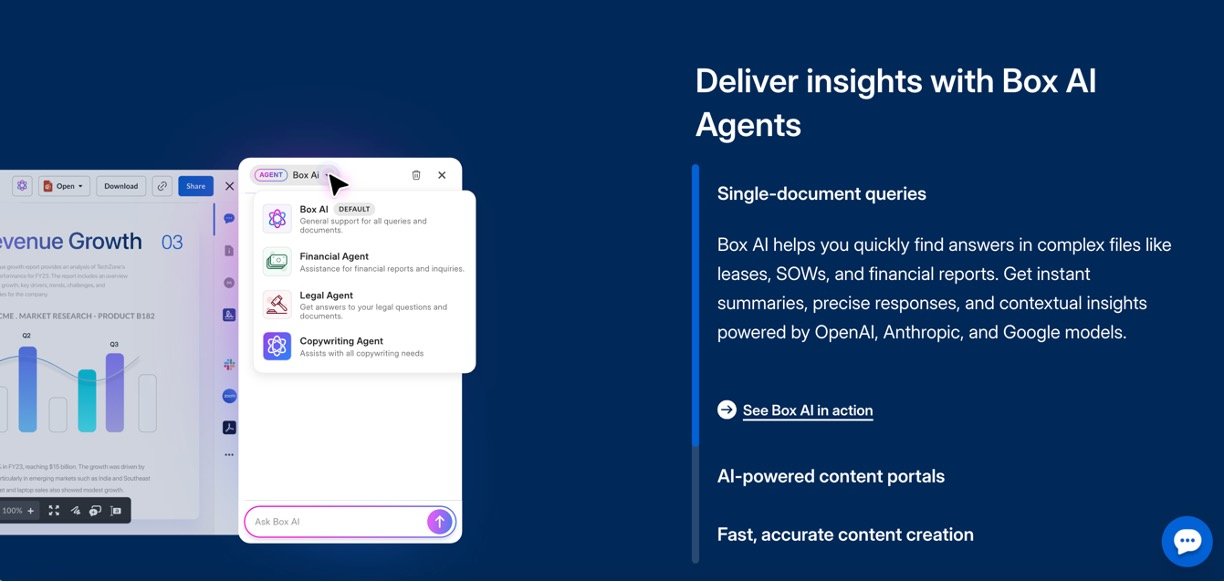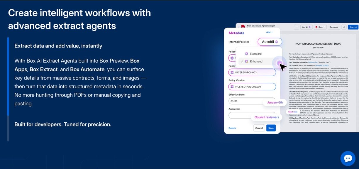 Box AI is an intelligent cloud content management platform that now integrates advanced AI agents to automate document processing, workflow management, and data protection for businesses of all sizes. Combining generative AI and agentic tools, Box AI extracts insights from unstructured data, streamlines digital workflows, and delivers continuous security—making complex content tasks much simpler and faster for non-technical users.