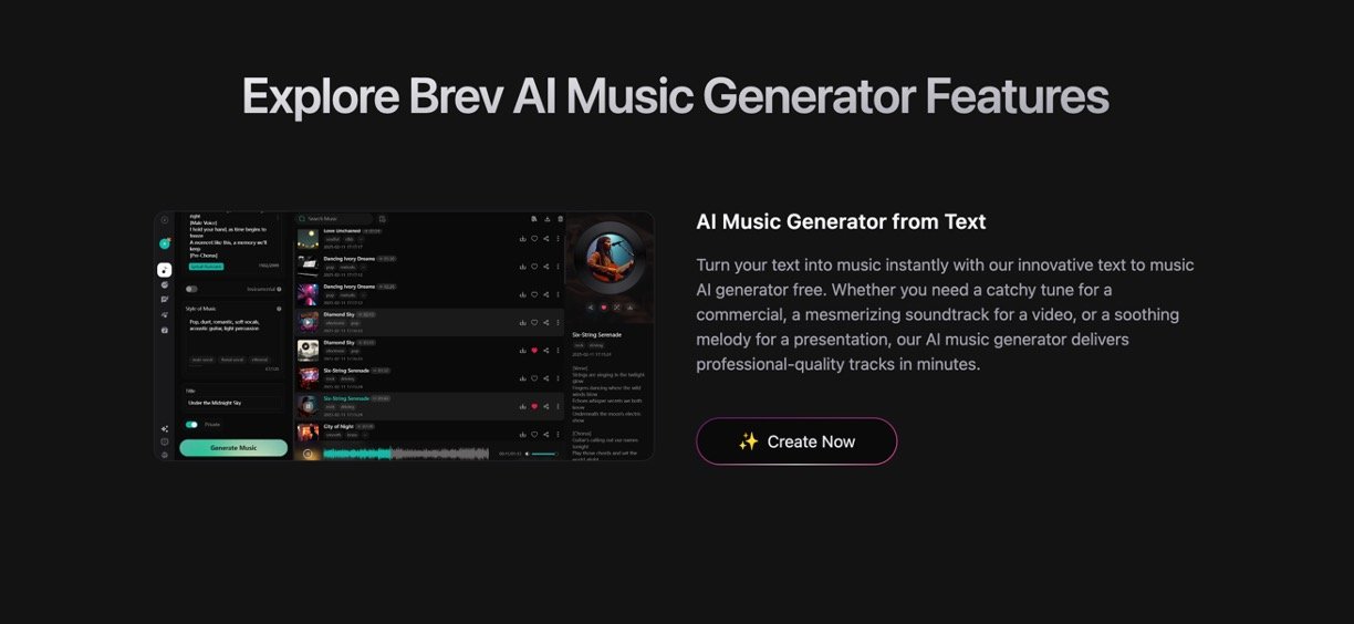 Brev AI is a powerful, easy-to-use online AI music generator that transforms text descriptions or song lyrics into professional-quality, royalty-free music tracks in minutes. Utilizing advanced AI technology, Brev AI supports a wide range of musical genres and styles, allowing users with no musical background to create fully customized music effortlessly. The platform also offers tools such as an AI vocal remover, AI lyrics generator, sound effects generator, and an MP4 lyrics video creator, enabling content creators, marketers, musicians, and educators to produce, customize, and share original music and audio content efficiently.