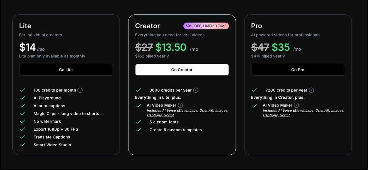 • 40+ visual styles, unlimited edits, and one-click resizing for platforms like TikTok, YouTube Shorts, and Instagram.​