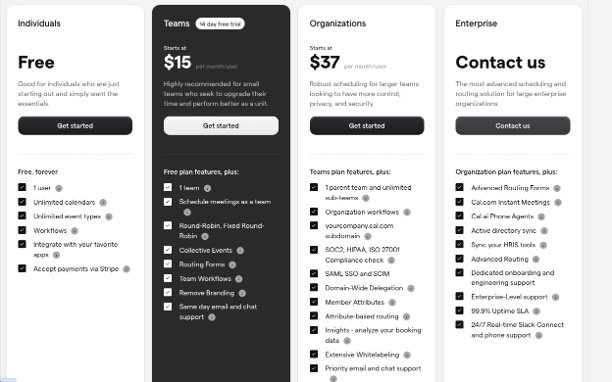 • Security and Compliance: Cal.ai is built with user privacy in mind, offering self-hosting options and compliance with standards like SOC 2, GDPR, and HIPAA.