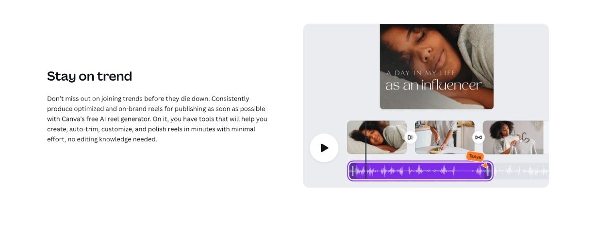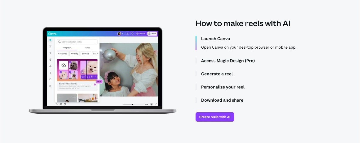 Canva AI Reel Maker lets you generate full Reels from a text description, pulling in matching clips, music, and effects automatically. You can tweak everything with drag-and-drop tools, like swapping fonts or adding your own photos, then download watermark-free MP4s ready for Instagram. It's built for quick content creation so you stay on top of trends without hours of editing.