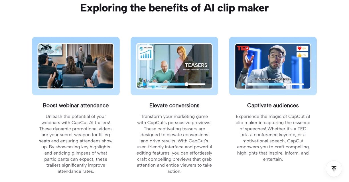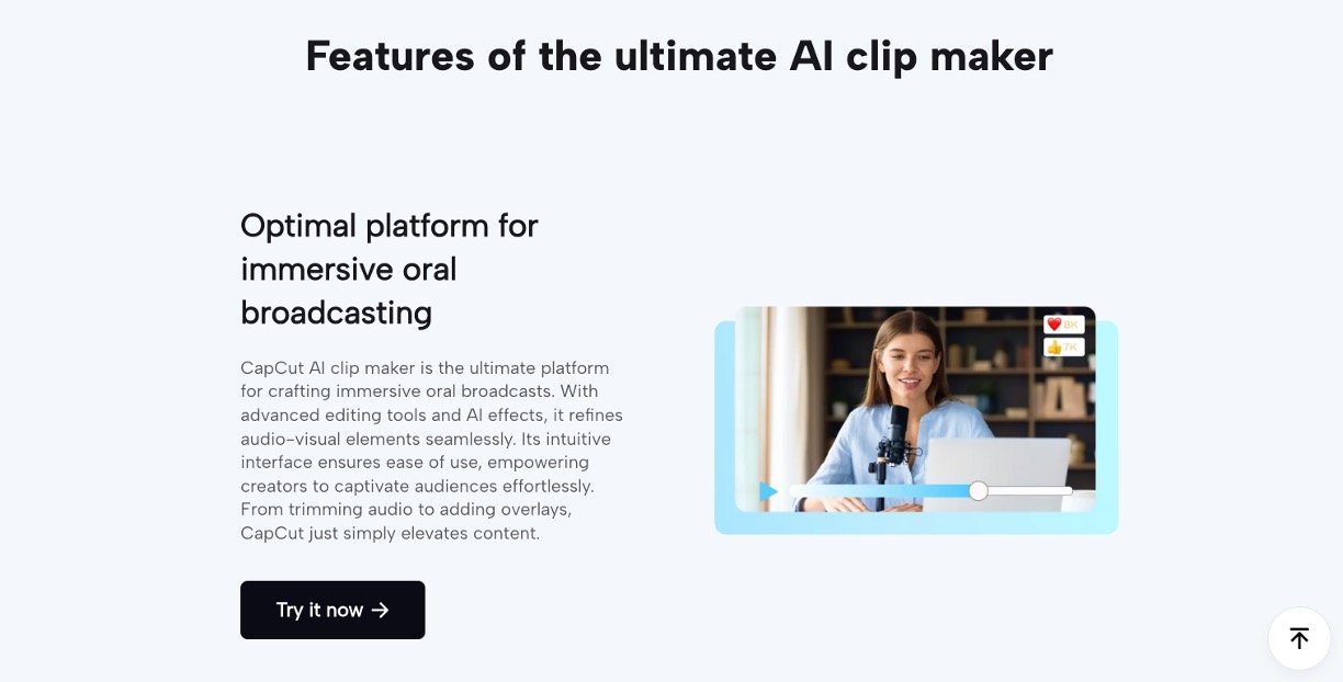CapCut AI Clip Maker is a user-friendly tool that uses smart AI to automatically turn your long videos into short, engaging clips perfect for social media. Just upload your video, and it analyzes key moments using scene detection, adds subtitles, and suggests the best highlights—no editing skills needed. It's designed for beginners, making pro-looking shorts from webinars, speeches, or any footage in minutes.