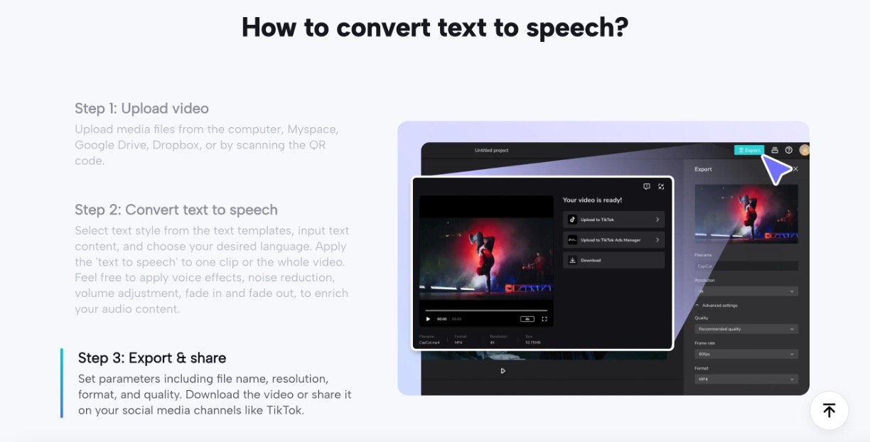 Built into a full-featured video editor with simple steps to add TTS to video clips.