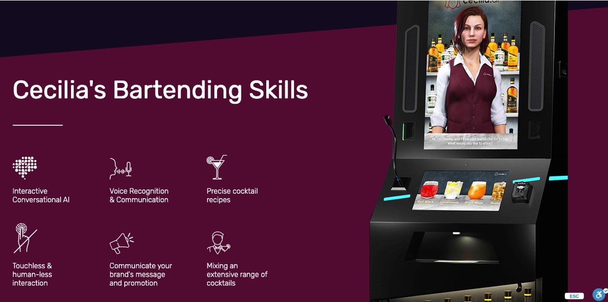 Cecilia AI is the world's first interactive robotic bartender that combines precise cocktail-making with conversational AI and voice recognition. Standing seven feet tall with a CGI female avatar, Cecilia can engage customers with chat, jokes, and personalized drink recommendations while creating up to 120 cocktails per hour using recipes crafted by renowned mixologists. Designed for hotels, airports, VIP lounges, and events, Cecilia offers contactless service with age verification and secure payment methods, enhancing customer experience and operational efficiency. Businesses also benefit from actionable insights on customer preferences and peak times through Cecilia’s business intelligence.