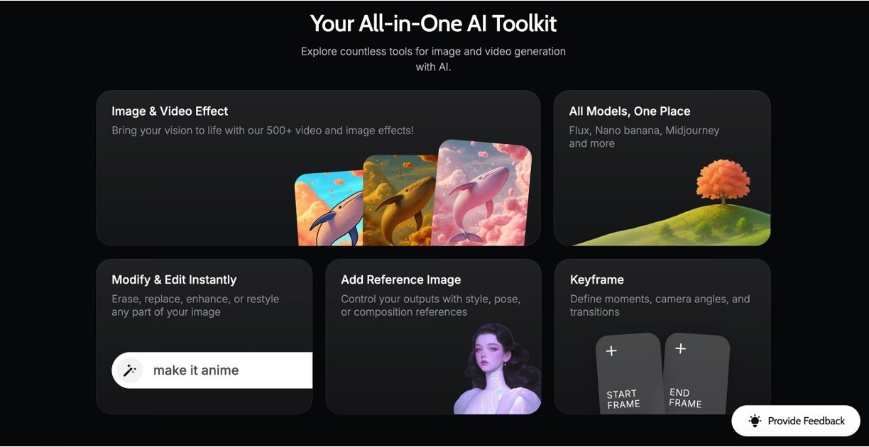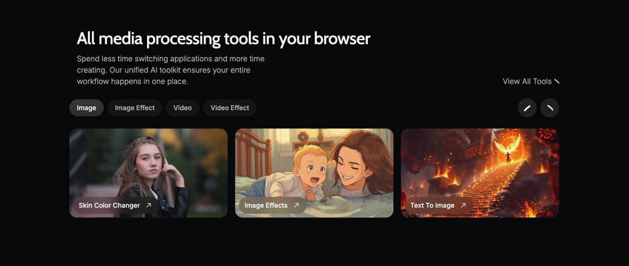 • All-in-One Toolkit: Access text-to-image, upscalers, background removers, and tools like hair/eye color changers without leaving the platform.