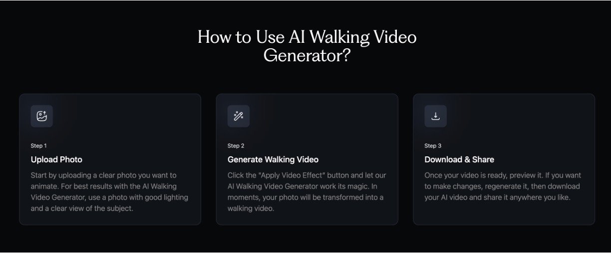 Works with any image type (real photos, artwork, cartoons) and generates smooth, natural walking movement.
