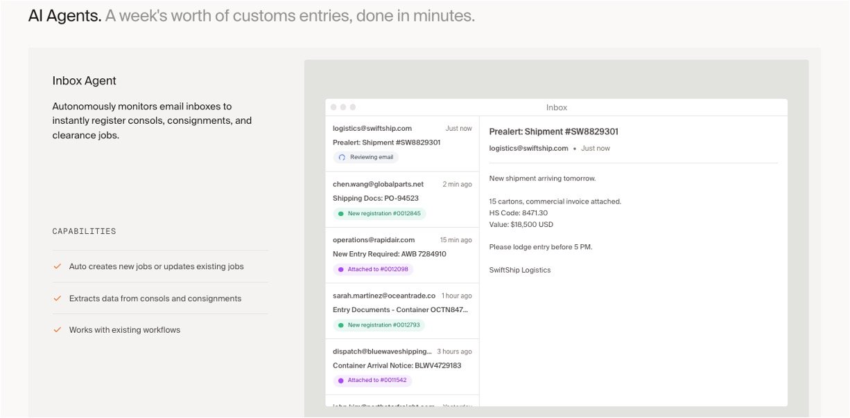 Automated inbox management and customs job registration for faster processing.