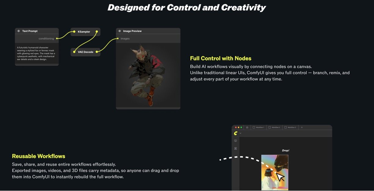 Reusable Workflows: Save, share, and reuse entire workflows, including metadata embedded in generated images, videos, or 3D files for easy collaboration.