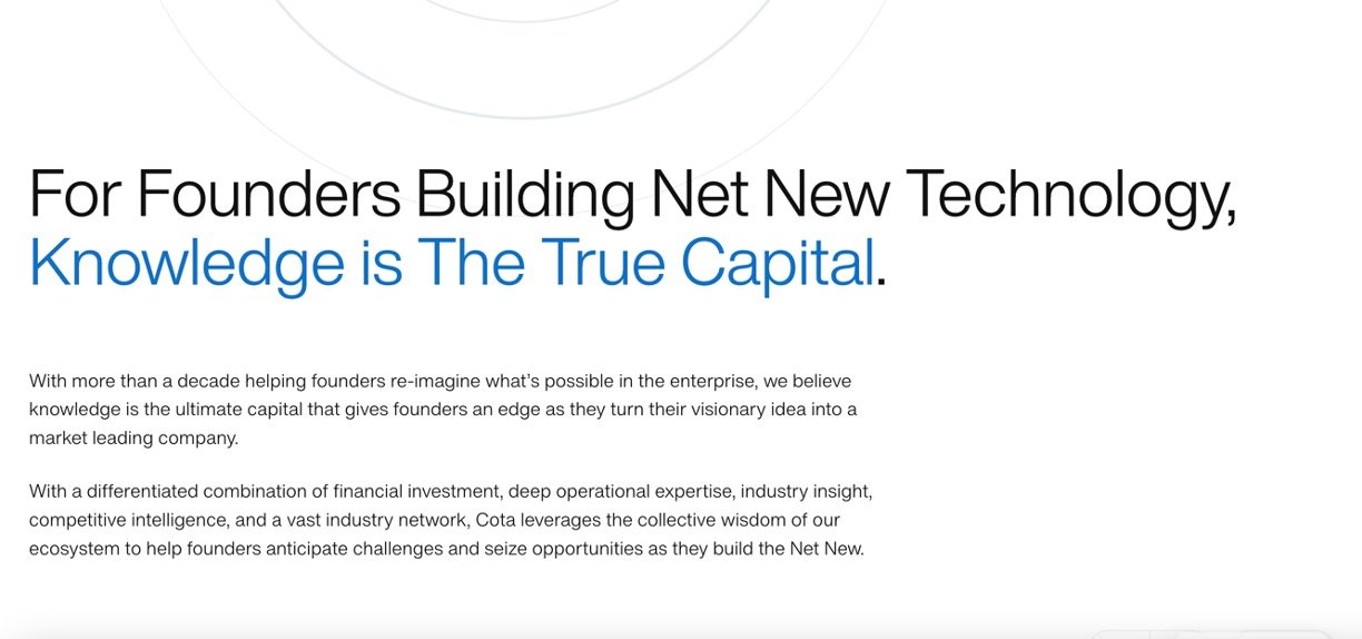Cota Capital is a San Francisco-based early-stage investment firm specializing in “Net New” technology companies that are building foundational, enterprise-level innovations. Their approach combines deep operational expertise, rigorous analysis, and bespoke partnerships to help visionary founders turn breakthrough ideas into market-leading companies. With over a decade of experience, Cota leverages extensive industry insight and a vast ecosystem network to anticipate challenges, accelerate growth, and deliver long-term value beyond traditional venture capital. Their portfolio spans diverse sectors including cloud computing, AI, blockchain, healthcare, fintech, and more.