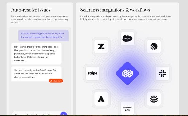 Seamless Integrations: The platform integrates effortlessly with existing tools, data sources, and workflows, allowing businesses to build AI solutions without the need for traditional decision trees or canned responses.