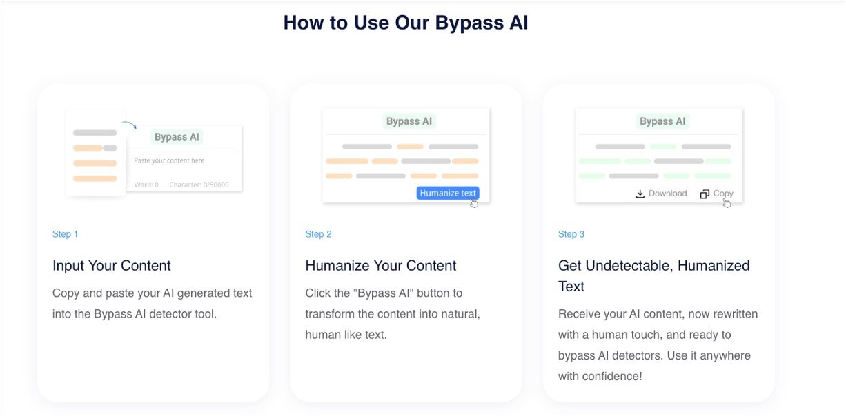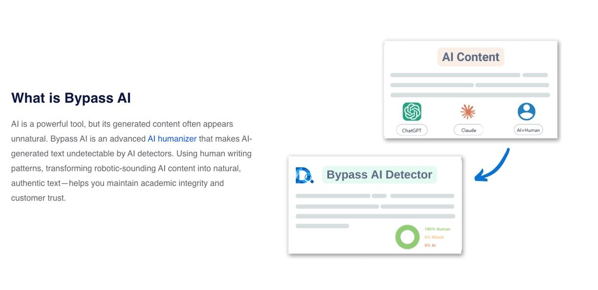 Bypass AI from Decopy AI turns robotic AI-generated text into natural, human-like writing that slips past AI detectors effortlessly. No more frustrating flags on your essays, blog posts, or business content – just paste, click, and get 100% human scores instantly. It's free, super simple, and perfect for anyone who wants authentic-sounding words without the tech hassle.​