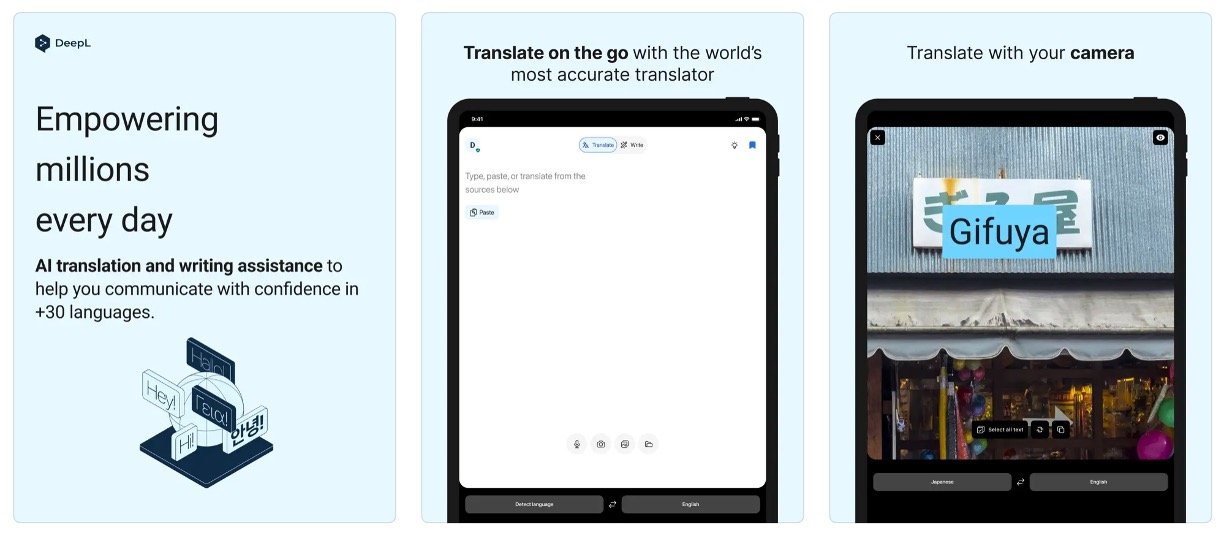 DeepL Translate is a leading AI-powered translation and writing assistant app known for its high accuracy, context-aware translations, and powerful language enhancement features. Supporting over 30 languages, DeepL excels at preserving tone, style, and intent in translations, making it ideal for professionals working with technical, legal, academic, and specialized content. The app offers unlimited text translation, custom glossaries for terminology management, and advanced neural network processing for natural and precise language output. Additional capabilities include photo translation via camera, file translation for Word, PowerPoint, PDF, and HTML documents, speech-to-text functionality, text-to-speech playback, and alternative phrase suggestions. The app includes features for formal and informal tone adjustment and translation history management.
