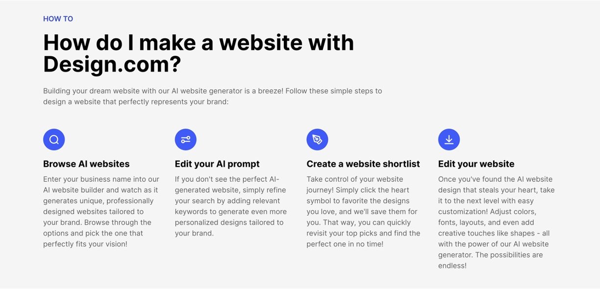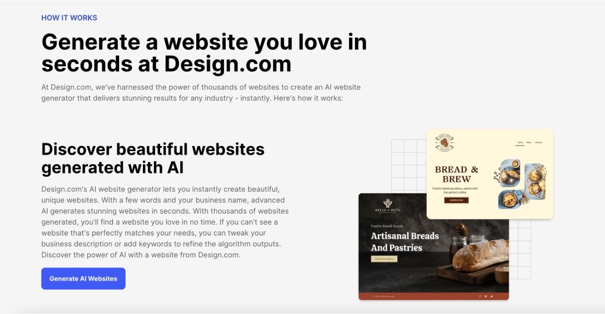 AI-powered creation of logos, websites, social media graphics, business cards, and marketing collateral.
