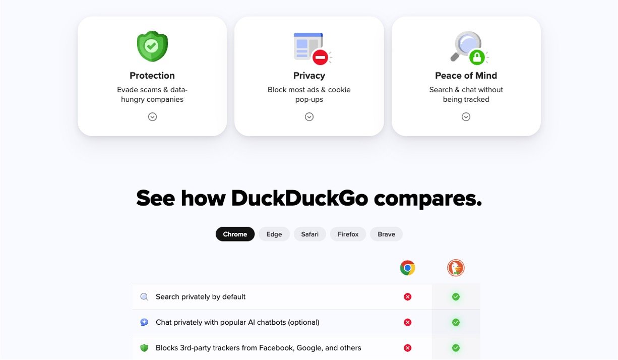 DuckDuckGo is a search engine and web browser that puts user privacy first. Unlike other search engines, it never tracks or stores personal data or search histories, ensuring private, unbiased search results. It blocks hidden trackers, stops unwanted ads, and encrypts connections to keep user data safe. DuckDuckGo also offers convenient features like instant answers, customizable settings, and easy-to-use interfaces for users with any tech background.