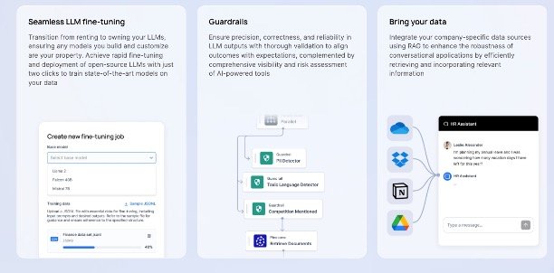 LLM Fine-Tuning: Offers the ability to fine-tune large language models on proprietary data, enabling the creation of AI agents tailored to specific business needs.