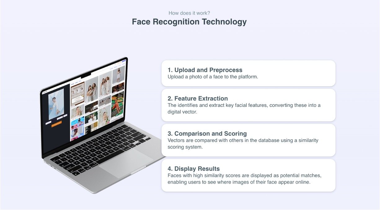 Extracts key facial features and compares them to a huge online database for accurate matches.